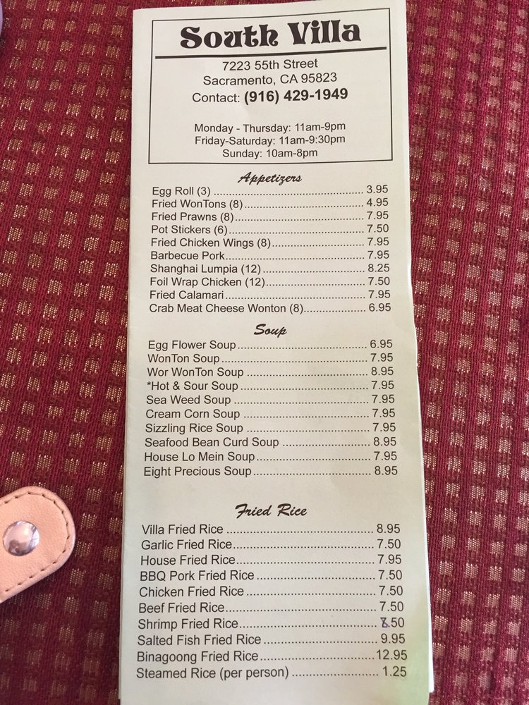 Located in Sacramento, CA, South Villa Restaurant offers a diverse menu of Chinese cuisine, including appetizers like Barbecue Pork and Crab Meat Cheese Wontons. The restaurant is known for its flavorful Fried Rice options, such as BBQ Pork Fried Rice and Shrimp Fried Rice. They also serve a variety of Soups, like Hot and Sour Soup and Seafood Bean Curd Soup. Customers praise the genuine and delicious food, with favorites including Kare-Kare and Laing. The ambiance is described as typical Chinese/Filipino with a touch of aloha, creating a warm and inviting atmosphere. Overall, South Villa Restaurant is a must-visit spot for authentic Chinese cuisine in Sacramento, satisfying cravings for home-cooked meals with each bite.